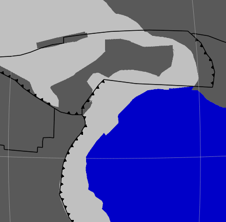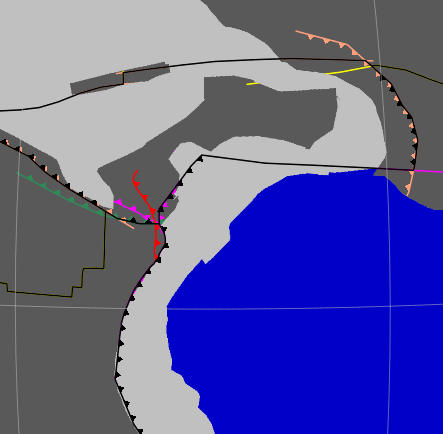As an aside, it’s possible that a subduction line is shared by two adjacent topologies in two different layers. For example, a deforming network (in a brown layer) and a rigid plate (in a purple layer) could share a subduction line between them. In this case, the subduction teeth get coloured twice. Once by the deforming network and once by the rigid plate (which are in different layers with presumably different draw styles). Then whichever layer is on top determines the final visible colour of the teeth.