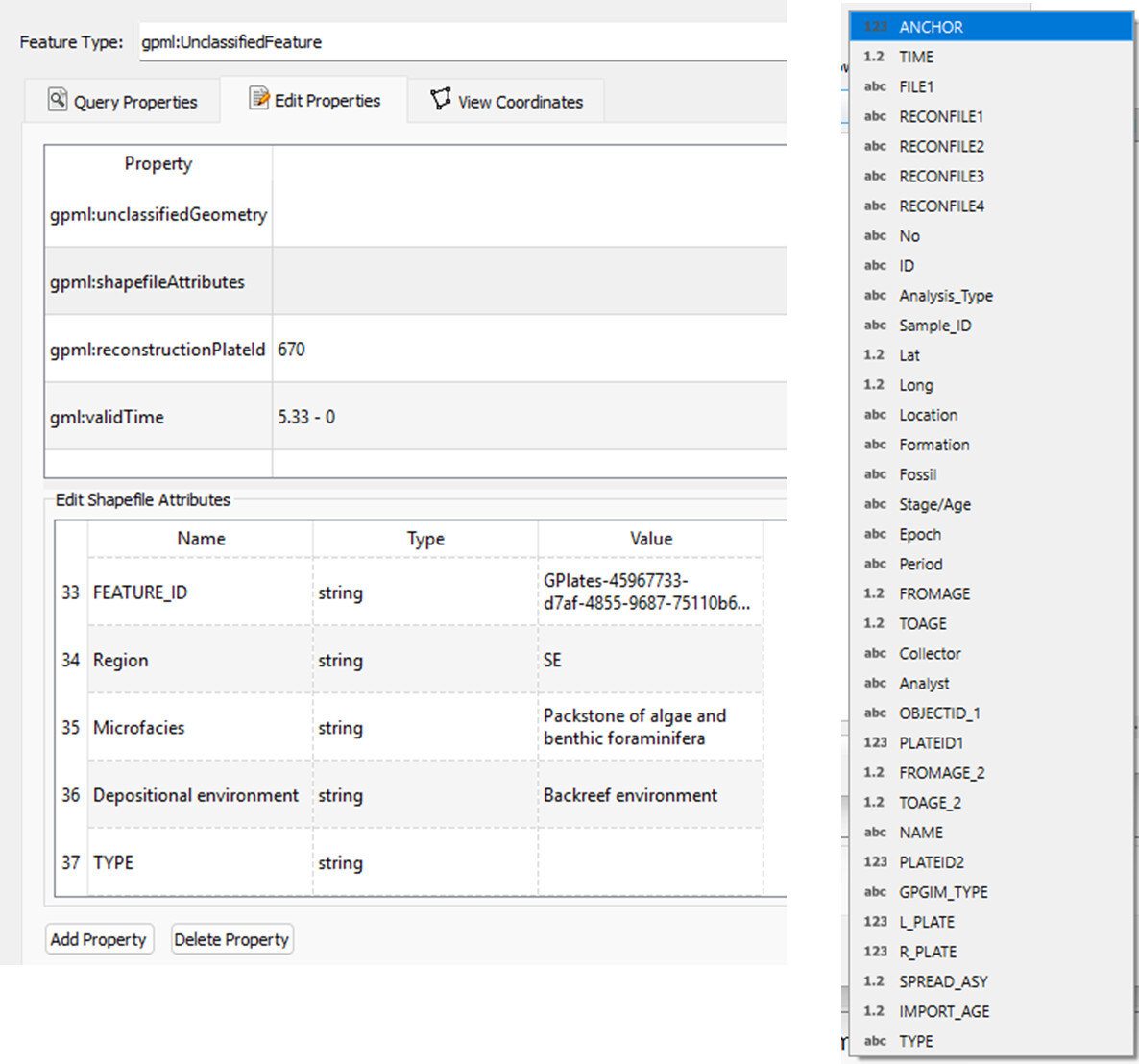 On the left side of this screenshot, which was opened in GPlates, is a .gpkg file which contains gpml:shapefilesAttribute of region, microfacies, depositional environment, etc.